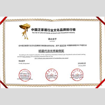 頒發(fā)單位:中國泛家居行業(yè)文化品牌排行榜組委會、中國明星經(jīng)紀人協(xié)會、廣東咉山紅傳媒有限公司