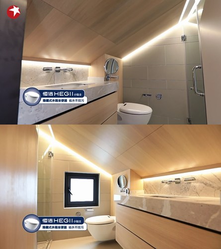 在二樓,設(shè)計(jì)師巧妙地利用了斜坡屋頂,在層高不夠的地方為兩間套房各打造了一間衛(wèi)生間,方便女兒一家四口的洗漱。恒潔的隱藏式水箱坐便器,在其中更加節(jié)省了衛(wèi)生間的空間,更顯美觀。