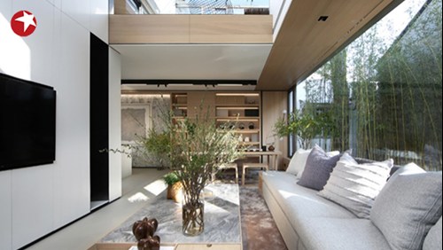 由于老宅的北墻和西墻都與鄰居緊緊相鄰,加之周圍鄰居都加蓋了二樓,只有東墻可以采光,于是設(shè)計(jì)師在客廳東墻選用了一塊長4.7米、寬2米,重達(dá)半蹲的超大玻璃窗,其充分引入了自然采光,使整個(gè)室內(nèi)更加明亮、柔和。